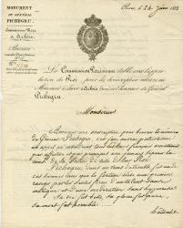 PICHEGRU Jean CharlesEnsemble de 3 documents datés de 1823, concernant la construction d’un monument en l’honneur de Pichegru à Arbois : état nominatif des officiers de la garnison de Rocroy qui ont participé à la souscription pour l’érection d’un monument et 2 circulaires lithographiées avec en-tête imprimé « Monument du général Pichegru ». Sur l’une figure une réaction manuscrite : « Votre Pichegru était un assassin comme les Georges [Cadoudal], les Polignac, les Lajolais et tant d’autres qu’on comble d’honneurs aujourd’huy. Dieu me garde de jamais rien faire pour la mémoire de gens semblables. »