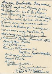 DESNOYER FrançoisLettre autographe signée, adressée au critique dart Georges Boudaille. Sans date ; 1 page in-4°. « Mon cher Boudaille. Bon souvenir de Sète où je suis toujours, je nai une exposition sur la Bretagne quen mai chez Guiot à la rue de la Boétie ou je pense avoir le plaisir de vous voir. Ce mot pour vous recommander des oeuvres des docteurs qui me soignent ici, si vous vous occupez de ce Salon des Médecins je pense que cest pour le placement ». Il donne les noms des médecins avec des noms de ses tableaux. On joint des coupures de presse représentant des tableaux avec notes manuscrites.