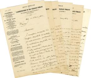 DALY César6 lettres autographes signées. 1862 ; 14 pages in-8°, la majorité sur papier à en-tête de la Revue Générale de lArchitecture et des travaux publics. Il est question de géomètres et de bornage de propriétés.