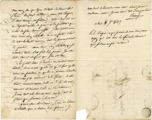 BÉRANGER Pierre-Jean deLettre autographe signée, adressée à Mme Fabreguettes. 8 janvier 1827 ; 2 pages 1/2 in-8°, adresse avec marques postales. «Vous faites bien de prendre mon habitude et d'écrire quand vous voyagez. Cela m'a valu une jolie lettre bien aimable et dont vous pouvez croire que je sens tout le prix. [ ] Je veux pourtant vous aller voir cette semaine, mais voici une autre anicroche. Mme Gevaudan, qui me fait passer en revue par tous ses vieux amis et qui prétend que je lui ai donné parole pour mercredi en m'entendant dire que je croyais pouvoir aller à Bagneux demain, mardi, m'a rappelé ce qu'elle appelle ma promesse, me sommant de la tenir au nom de l'amitié. Elle est si bonne que je n'ai pas osé lui résister, cependant j'en avais bonne envie. Au moins vous ne présumez pas que c'est pour m'amuser que j'éloigne l'instant de vous aller voir dans votre solitude. [ ] Vous aurez su quelques détails du dîner de Fleury. Les deux sultanes [ ] se sont retrouvés en présence. Toutes deux ont eu une dignité mêlées de grâce et de politesse qui a été du plus heureux effet. J'étais invité, mais mon dîner chez Achille, m'a empêché d'être de cette brillante réunion, dont les journaux auraient du parler. Mon dîner chez Achille, que je redoutais tant, s'est fort bien passé. J'en suis sorti sain et sauf, et qui plus est roi. » Il a reçu une lettre d'Emilie qui doit se soigner.