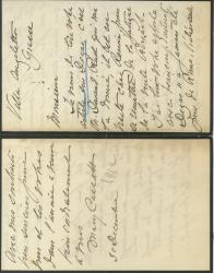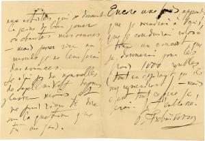 CassattLettre autographe signée à Achille Segard. Villa Angeletto à Grasse, « 31 décembre » [1912]. 3 pp. 1/2 in-12, liseré de deuil. « Je viens de lire votre article sur Degas [dans l’Écho de Paris], c’est M. Durand-Ruel qui me l’a donné [le marchand d’art Paul Durand-Ruel, proche des impressionnistes], il est en visite chez Renoir pour se remettre de la fatigue de la vente Rouart [les deux premières parties de la vente de la collection Rouart se déroulèrent du 9 au 18 décembre 1912, avec Paul Durand Ruel comme expert]. J’ai lu votre article avec beaucoup d’intérêt. Degas n’a jamais été prix de Rome, l’idée seule le ferait bondir. Je ne trouve pas juste de dire que les femmes n’ont pas pris, ou n’ont pas aimé son art. Le premier Degas qui est allé en Amérique a été acheté par une jeune fille, et j’en connais d’autres, et à la vente plusieurs femme[s] était parmi les acheteu[rs]. On aurait voulu l’être, seulement les prix ont été tellement au-dessus de ce qu’on a supposé qu’ils serai[en]t. Une amie a laissé un prix de 75000 fcs pour Les Modistes et ne l’a pas eu. J’espère que vous allez bien et que Madame Segard aussi ne souffre plus des mauvais temps à Paris. Ici nous avons eu beaucoup de soleil, mais il m’a fallu du temps pour m’acclimater et je n’ai pas encore repris le travail. » La peintre Mary Cassatt, liée aux impressionnistes, fut une des rares à trouver grâce aux yeux critiques d’Edgar Degas : les deux artistes nouèrent une amitié non exempte d’orages en raison de leurs caractères bien trempés. L’écrivain, critique d’art et de littérature Achille Segard publierait en mai 1913 chez Ollendorff la première étude jamais publiée consacrée à Mary Cassatt : Un Peintre des enfants et des mères. Mary Cassatt.