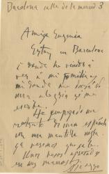 PICASSOLettre autographe signée adressée à Eugenia Errazuriz ( 1860-1951). Barcelone Calle de la Merced 3 ; 1 page in-8° . Très bon état. ( juillet-août 1917 ) Picasso est arrivé à Barcelone et commence un portrait d’une espagnole. Celèbre tableau qui se trouve au musée Picasso de Barcelone “ Dona amb mantellina ”. « Amie Eugenia, Je suis à Barcelone où je suis venu voir ma famille, et ainsi où que j’aille vous serez une joie si vous m’écrivez. J’ai commencé un portrait d’une espagnole avec une mantille noire. Nous verrons ce que cela donne. Des baisers appuyés sur vos mains. Picasso ». Cetificat du comité Picasso. Provenance : Eugenia Errazuriz : celèbre mecène chilienne d’origine basque, décoratrice d’intérieur qui avait comme amis de nombreux peintres et écrivains Picasso, Stravinsky, Cocteau ...