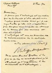 SOUPAULT PhilippeLettre autographe signée, adressée à un astrologue. 21 février 1972 ; 1 page in-4°.« Je pense que l’astrologie est une science qui mériterait d’être étudiée avec le plus grand sérieux mais qu’il est regrettable qu’elle soit “exploitée” par des gens sans scrupules en abusant de la bonne foi des anxieux et des désespérés. L’astrologie est une des branches de la méconnaissance de la destinée humaine. »En post-scriptum, il rajoute : « Mon ami André Breton, à la fin de sa vie m’avait déclaré qu’il attachait de l’importance à la découverte de l’astrologie. »