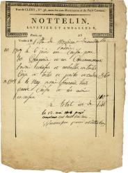 FACTURES ANCIENNES DE PARIS.Ensemble de 9 factures de Paris. 1802-1818 ; 6 pages in-4° et 2 pages in-12 oblongues. Ces factures sont libellées à l’ordre de M. de Vandeuil (gendre de Diderot).Factures de la maison Gindre (papiers peints pour tentures) ; maison Simon (2) boulevard Porte Denis, au coin de la rue de la Lune (manufacture de papiers peints pour tentures et décorations) ; maison Hemery (marchand fayancier) ; maison Landry (épiceries, droguerie, liqueurs) ; maison Maurice (gantier, parfumeur-distillateur) ; maison Marsault-Marlin (magasin de couvertures en laines) ; maison Allez (outils de sculpteurs, menuisiers, et quincailleries) ; maison Nottelin (draperies).