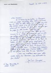 SAMPREDO José LuisLettre autographe signée, adressée à Gérard Leman. Madrid, 24 janvier 1999 ; 1 page in-4°, enveloppe timbrée jointe.« Je vous remercie de vos éloges si généreux et, pour ne citer que quelques auteurs — je ne peux pas écrire une longue liste — je dois m’avouer un lecteur fidèle des grands romanciers. La Guerre et la Paix, de Tolstoï, est pour moi le grand chef-d’œuvre et, parmi les français, j’admire Stendhal, la grande Madame Bovary et, de nos jours, A. Camus. Sans doute j’oublie des noms — T. Mann, D.H. Lawrence, Faulkner, et un faible pour l’art de Colette — mais ça vous donne une idée de ma “filiation”. »