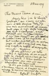 BONFILS RobertBONFILS Robert [Paris, 1886 - id., 1972], peintre français.Lettre autographe signée, adressée à Jean René Thomé. Paris, 7 mars 1959 ; 1 page in-8°. « Depuis hier, j’ai le Courrier Graphique qui s’ouvre sur mon nom et votre élogieux texte. Je vous suis reconnaissant de consacrer huit pages à mon œuvre d’illustrateur avec tant d’indulgence, excepté cependant, pour ma Clara d’Ellébeuse […] qui a pourtant des fidèles ! Mais il est impossible de tout montrer et de tout dire en quelques pages et vous l’avez fait avec beaucoup d’esprit, de talent et de sympathie, comme... toujours. »