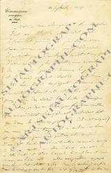 BIOT Jean-BaptisteLettre autographe signée, adressée à M. Gaimard. 10 septembre 1839 ; 1 page in-8°. En-tête imprimé « Commission scientifique du Nord ». Amusante lettre sur un voyage et sa confrontation aux intempéries. Il y est question d’une boussole que n’ont pas su utiliser des voyageurs « au milieu des embarras que la brume, la pluie et les marais ». « Ma bonne petite Léonie a très bien supporté les événements de la route, seulement elle est faible et comme nous aurions des rivières trop hautes à traverser, nous allons prendre un bateau […]. Il nous est tombé et il va tomber encore des averses à ne pas mettre un chien dehors. Nous avons bu à votre santé et à tout le monde à neuf heures et demi. »