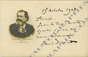 DRUMONT ÉdouardCarte autographe signée. 15 octobre 1903 ; 1 page in-12 oblongue sur carte photographique avec son portrait. « Je suis très touché de votre sympathie et je vous en remercie cordialement. »