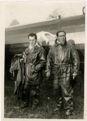 COSTES DieudonnéPhotographie signée. 18 x 12,8 cm. Photographie le représentant avec Maurice Bellonte devant l’avion, le Point d’Interrogation. (Cliché Studio Intran).