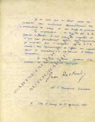 ROSTAND JeanLettre autographe signée, adressée à Mme Suzanne Arnoux. Ville-d’Avray, 19 décembre 1935 ; 2 pages in-4°, traces de mouillures sur certains mots.« J’ai appris avec étonnement que la Radio Télévision belge a récemment diffusé un enregistrement de Cyrano de Bergerac. Je n’ai reçu pour mon propre compte aucune demande d’autorisation et je ne sache pas que vos services m’en aient transmis une. Vous savez d’ailleurs que […] je ne pourrais donner une telle autorisation qu’avec l’accord total de MM. Janvier et Hautin, mon acceptation, demeurant, en tout état de cause subordonnée à la leur. Je ne puis que m’élever contre un procédé qui contrevient désagréablement aux conventions en usage et au droit des personnes. En conséquence […] je considère que l’initiative de la R.T.B. cause, aux représentations de l’œuvre, un préjudice dont il appartient à vos services d’obtenir réparation. »