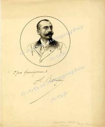 ROUJON HenryPensée autographe signée. 1 page in-4° (30 x 24,5 cm).Sous son portrait original à l’encre de Chine signé par Robert Kastor : « Opus francigenum. H. Roujon ».