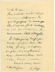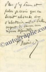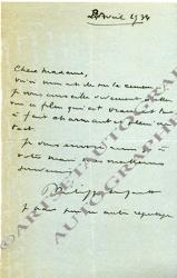 PUVIS DE CHAVANNES PierreLettre autographe signée, adressée à un ami. Sans date ; 1 page 1/2 in-12, à la mine de plomb. « Pourrez-vous venir me prendre demain matin place Pigalle à 9 h, j’irai au pavillon de la ville de Paris et vous chez Beraud — c’est tout près — nous pourrons ainsi causer de l’affaire. Plus j’y pense et plus je crois que ce serait absurde de s’abstenir. »