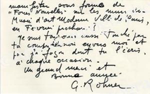 ROHNER GeorgesCarte autographe signée, adressée à Jean-Marc Campagne, journaliste à Paris-Jour. [1979] ; 13 X 8 cm, enveloppe jointe. « Merci de l’envoi de Nice Matin. Tu es toujours aussi jeune et aussi enthousiaste dans tes manifestations et j’espère l’être resté presque autant que toi ! À ce propos, sais-tu que notre jeunesse va se manifester sous forme de “Forces Nouvelles” sur les murs du Musée d’Art Moderne, Ville de Paris, en février prochain ? Je suis toujours aussi touché par ta compréhension envers moi et par la façon dont tu l’écris, à chaque occasion. »