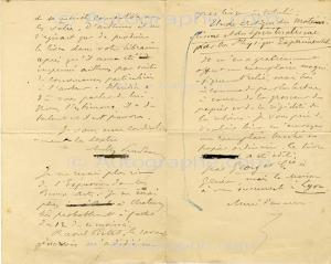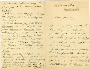 DELIBES LéoLettre autographe signée. « Choisy-au-Bac, mardi matin » ; 4 pages in-12. « Mais si la jeune personne nous est utile, je n’hésite pas à la prendre. […] Seulement toute la question est là. Est-elle capable de bien interpréter le rôle et de lui donner le relief et l’autorité suffisantes pour implanter la pièce à Milan surtout après l’accident de Rome, à l’apollo ? A-t-elle assez de voix pour cela ? Est-elle sympathique au public Italien etc, etc. Je me rappelle tout ce que Gonzague nous a dit à ce sujet pour nous décourager de la prendre, il y a deux ans. C’est lui seul qui peut juger la chose au point de vue de ce terrain qu’il connaît si bien. Quant aux avantages, je vois ceci qu’elle est mieux, je le crois en chantant, l’italien que le français. »