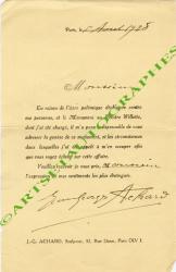 ACHARD Jean GeorgesEnsemble de 3 cartes autographes signées et d’1 lettre signée :— Paris, le 30 octobre 1927 ; 140 X 90 mm. Au dos d’une carte postale représentant son ensemble « Apothéose de la Cuisine Française ». « Ma femme est fort souffrante et alitée depuis quelques jours mais j’espère sur une amélioration de son état de santé, qui me permettra d’assister vendredi prochain au déjeuner du Chabrot. »— Paris, le 28 novembre 1927 ; 140 X 90 mm. Au dos d’une carte postale représentant sa sculpture « La Cadichonne ». « C’est entendu en principe, j’assisterai vendredi au déjeuner du Chabrot que vous présiderez mais ma venue est subordonnée à l’état de santé de ma femme alitée depuis 5 semaines. » — — Paris, le 1er août 1928 ; 1 page in-8°. « En raison de l’âpre polémique déchaînée contre ma personne et le Monument au Peintre Willette, dont j’ai été chargé, il m’a paru indispensable de vous adresser la genèse de ce monument et les circonstances dans lesquelles, j’ai été appelé à m’en occuper. »— Paris, 23 février 1931 ; 140 X 90. Au dos d’une carte postale le représentant. « J’ai été très touché de l’aimable pensée que vous avez eue d’improviser ces jolis vers que vous avez dit à mon banquet. »