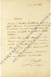 DAUZATS AdrienLettre autographe signée. 16 décembre 1849 ; 1 page in-8°. Il remercie son correspondant « d’avoir fait insérer mon nom au registre du contrôle du Théâtre Historique. Je suis bien sensible, Monsieur, à la décision que vous avez bien voulu prendre en ma faveur. »