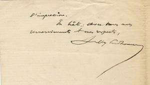 SULLY PRUDHOMME (René François Armand Prudhomme, dit)Lettre autographe signée, adressée à une femme. « Mercredi » ; 1 page 1/4 in-8°. Il lui a envoyé son manuscrit d'une pièce. « Ce n'est pas un poème; et je crains que vous ne soyez déçue. » Il pourrait lui envoyer une oeuvre plus grave et importante, l'épilogue de son poème intitulé La Justice qui va paraître. « C'est un poème d'environ trois mille vers où le poète s'est mis à la recherche de la Justice et, après en avoir vainement demandé le fondement aux sciences seules, en retrouve le témoignage dans la conscience. »
