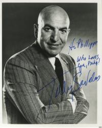 SAVALAS TellyPhotographie dédicacée en anglais ; 21 x 27 cm. Portrait en noir et blanc, du célèbre interprète de la série américaine Kojak.