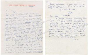 HEMINGWAY ErnestLettre signée « Ernest », adressée à son ami Bill Davis. 5 septembre 1960 ; 6 pages in-4°. En-tête gravé : « Finca Vigia, San Francisco de Paula, Cuba ». Superbe et longue lettre à son ami qu’il avait surnommé « Negro ». Le corps de la lettre est de la main de Valerie Danby-Smith, une journaliste qu’Hemingway avait connue à Pamplona quand il avait des difficultés avec sa vue. Il est question d’un article sur la tauromachie écrit en trois parties pour le magazine Life. Le manuscrit sera finalement édité à titre posthume dans ce qui sera considéré comme son dernier roman, The dangerous Summer [L’Été dangereux].« Thank you very much for doing such a wonderful job with the two Krauts. Annamarie’s letter finally came through and you were right that she does not know when she is well off. I cannot give her exact publication dates nor give her some clarity as to her working program for the next few years having just this morning...gone over 92,000 words on something that I hoped would not exceed 18,000 when I started with it. Still at least 15 days of steady work to go. I had to postpone the Paris Book from this fall. But you have to do one damned thing at a time... It was impossible for me to contract with Rowhowlt to write the book since over 60,000 words of it was written before he made the offer. It would be nice to have that money tax free... if Rowhowlt published it before Scribners did I could lose the American copyright... I would prefer not to have him advance me any money on anything where there are possible angles... For years I have never taken advances ever from people that I trusted. Then I took this advance from Life & it has been nothing but a headache... I could have stopped the work at a certain date... rewrite on the Paris book, had it in shape for Scribners & then returned to the bullfight thing & finished it off. But my head was forced by having to produce that cash to pay out Rice’s mistake... I hate to ask you to do anything else... [but] can you get me an account of the Cuenca fight. All I remember is the terrible state of the piso and how dangerous it was and that Pepe Casares would not deal with his bulls and that Chicuelo II & Antonio could, due to greater experience... preoccupation with the dangerous ring drives the rest of it out of my head. I also need accounts in the local papers of the fights in Muncia... I might be wrong in remembering whether Antonio did the truco of kneeling in front of the bull & throwing away the munleta & the sword in the first or the second fight... do you remember too what was done exactly about the picadorsat Cuenca, Villara... & Ronda? Juanito Quintana has looked up several of the fights... Have handled the picador business OK so far & have only one more fight to write, the Ronda one. It is a hell of a difficult book to write, Negro, because of the because of the way it ended & the moral angle & what transcends it is the only frame it goes on... I still have to keep on writing... Val has caught 2 good white marlin & is handling rod very well. Sorry this letter is all business & begging ... »Hemingway a finalement soumis un manuscrit de 75 000 mots au magazine, duquel un extrait de 30 000 mots a été édité en trois parties, la première partie a été éditée le même jour où cette lettre a été écrite. The Dangerous Summer sera publié après sa mort par Charles Scribner’s Sons en 1985.