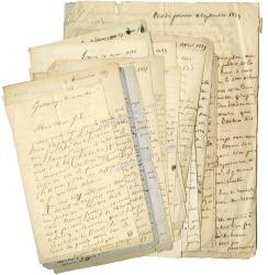 RIBEYROLLES CharlesTrès importante correspondance d’exil de 42 lettres autographes signées, adressées par Ribeyrolles à ses amis. Jersey, Guernesey, Londres, Petropolis, Saint-Vincent (île du Cap-Vert), puis Rio de Janeiro, entre 1858 et 1860.Correspondance très dense adressée à Fulbert Martin (7), Pianciani, Bonnet-Duverdier à Guernesey (25), divers amis à Rio. La dernière lettre, de ses amis, datée de Rio de Janeiro le 9 juillet 1860 relate l’enterrement de Charles Ribeyrolles et le choix de la pose d’une pierre tumulaire plutôt qu’un monument grandiose.On ne peut citer tous les détails de cette importante correspondance politique, consacrée à l’exil forcé de tous ceux qui avaient fui la France à la suite des événements de 1848 puis du coup d’État de 1851 qui évoque la vie mouvementée, les activités, les publications de l’auteur.Charles Ribeyrolles s’exile à Londres puis, après le coup d’État du 2 décembre 1851, sur l’île de Jersey. Il rendit visite fréquemment à Victor Hugo. Il devient le rédacteur en chef du journal hebdomadaire des proscrits, L’Homme, le journal de la Démocratie Universelle.Victor Hugo rédige son épitaphe, gravée sur sa tombe au cimetière de Catumbi à Rio de Janeiro :« À Charles Ribeyrolles.Il accepta l’exil ; il aima les souffrances ;Intrépide, il voulut toutes les délivrances ;Il servit tous les droits par toutes les vertus ;Car l’idée est un glaive et l’âme est une force,Et la plume de WilberforceSort du même fourreau que le fer de Brutus. »À cette correspondance sont joints 14 manuscrits (certains en fragments) d’articles politiques publiés dans L’Homme par Ribeyrolles et titrés « Bulletin politique », « Les dynasties », « L’assemblée de l’avenir », « La réaction espagnole », « Angleterre » « Espagne » ou « Italie », « Le 24 février », « Le traité de Paris », etc. Articles en majorité dirigés contre Napoléon III.Très bel ensemble pour chercheur ou centre d’archives.
