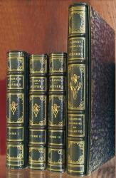 SAMAIN Albert [Lille, 1858 - Magny-les-Hameaux, 1900]« ŒUVRES ». Édition d’art H. Piazza, Paris, 1936, 4 volumes : — 3 volumes de texte. 21 X 15,5 cm. Exemplaire unique imprimé spécialement pour M. Laurent Meeus sur japon impérial, contenant 25 illustrations de W. Fel et, à la fin de chaque volume, une suite en couleurs et une suite en noir des illustrations. Dos et titres conservés. Reliures plein maroquin bleu avec les plats mosaïqués agrémentés de violettes aux quatre coins dans un entrelacs de filets dorés, dos à nerfs mosaïqués par des violettes. — volume d’aquarelles, Recueil unique contenant les aquarelles originales et accompagnant l’exemplaire unique imprimé sur japon pour M. Laurent Meeus. Paris, 1936 ; 200 X 280 mm. Volume contenant les 75 aquarelles originales de William Fel, relié dans un format plus grand que les volumes de textes. Reliure plein maroquin bleu avec les plats mosaïqués agrémentés de violettes aux quatre coins dans un entrelacs de filets dorés. Les contreplats (ou doublures) de la reliure de ce volume sont ornés d’un décor mosaïqué de violettes aux quatre coins dans une plaque de filets dorés, gardes de soie moirée vieux vert, doubles gardes, tranches dorées. Dos à nerfs mosaïqué par des violettes. Reliure de Cretté sous étui pour tous les volumes. Exemplaire hors norme.
