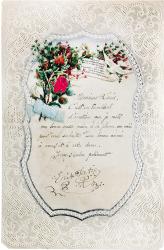 SATIE Erik (Alfred-Erik-Leslie Satie, dit)Lettre autographe signée, adressée au docteur Lemonnier au Havre. [Paris, 7 janvier 1905] ; 1 page in-8°. Sur lettre gaufrée et surmontée dun chromo, enveloppe jointe.« Monsieur Louis, Cest en tremblant démotion que je mets ma bonne grosse main à la plume que voici pour vous souhaiter une bonne année à vous et à votre dame.Je vous salue poliment. Erik Satie ».
