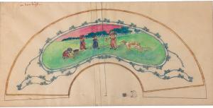 ROY LouisFillettes jouant dans un pré.Aquarelle en forme déventail sur papier calque.Signée en bas au milieu du tampon à son monograme.25,5 x 45 cm.