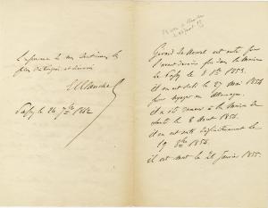 BLANCHE ÉmileExtraordinaire lettre autographe signée. Passy, 24 septembre 1862 ; 2 pages 1/2. « Je vous remercie de la lettre affectueuse que vous avez bien voulu mécrire [ ]. Je mempresse de vous adresser toutes les pièces dont je vous ai parlé qui peuvent vous intéresser, et je nai pas besoin de vous dire que japprouve davance tel usage quil vous plaira den faire. »À la suite de cette lettre, le remarquable passage sur Gérard de Nerval « Gérard de Nerval est entré pour lavant-dernière fois dans la maison de Passy le 8 8 bre 1853. Il en est sorti le 27 mai 1854 pour voyager en Allemagne. Il a été ramené à la Maison de santé le 8 août 1854. Il en est sorti définitivement le 18 8 bre 1854.Il est mort le 26 janvier 1855. »Le 27 janvier 1855, le docteur Blanche écrivait : « Se croyant la même énergie dimagination et la même aptitude au travail, Gérard de Nerval comptait pouvoir vivre, comme autrefois, du produit de ses uvres ; il travailla plus que jamais, mais il fut déçu dans ses espérances. Sa nature indépendante et sa fierté de caractère sopposaient à ce quil voulût rien recevoir, même des amitiés les plus éprouvées ; sa raison sest égarée, et cest bien certainement dans un accès de folie quil a mis fin à ses jours. »