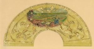 ROY LouisFillettes aux oies dans un parc.Aquarelle en forme déventail sur papier calque.Signée au milieu du tampon à son monograme.Datée 190220 x 39 cm.