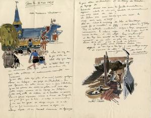 MÉHEUT MathurinLettre autographe signée, illustrée de 2 dessins signés, adressée à Mme Verdier. Paris, 11 mai 1926 ; 31 x 40,6 cm.Très belle lettre évoquant Raboliot de Maurice Genevoix.« Que vous avez de la joie dêtre au soleil alors que dans ce triste Paris nous ne connaissons plus que pluie et vent et que notre printemps si ardemment escompté va sévanouir. Je suis allé (voilà plus dun mois) passer quelques temps en Sologne, au pays de Raboliot, le prix Goncourt de cette année, pour en faire lillustration. Je me suis permis de couvrir ce petit mot avec deux petits croquis, souvenir de ce voyage en Sologne. Jétais assez près du château de la Sauldre, or comme lon na jamais répondu même à lenvoi de loriginal que javais fait pour le livre malgré vos recommandations, je me suis bien gardé de diriger mes pas de ce côté. Jai eu fort heureusement durant ce séjour un temps superbe et un accueil charmant de Genevoix le jeune auteur de Raboliot et de Rémy des Rauches, de Éparges, etc.Dimanche dernier nous avions la famille Manchotte à déjeuner. Inutile de vous dire combien et comment nous avons causé de vous ?Le docteur sera aussi heureux que nous, revoir les vrais amis sont si rares. Hier soir, cétait le vernissage du salon des Décorateurs. Monde fou et innovation ! un jazz... cétait épatant au Gd Palais. Tous ces spectacles intellectuels, uniques à Paris, compensent heureusement la vilaine saison. A la maison tout le monde va bien et vous adresse leurs compliments et tous leurs bons souhaits de bon séjour, tout en se réjouissant de vous revoir au plus vite. »