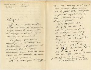 CLAUDE GeorgesLettre autographe signée. Montereau, sans date ; 2 pages in-8° sur papier à son adresse à Montereau. Très intéressante et rare lettre scientifique relative à la fabrication de l'ammoniac. Dans cette lettre vraisemblablement datable de 1917, Georges Claude développe son procédé de fabrication de l'ammoniac. « Dans ces petits tubes de 8 mm de diamètres intérieurs, avec mes procédés de catalyseurs de 15 gr répartis dans 10 cm de longueur (soit D app. = 3) on obtient couramment à 550° 500 l de gaz à 29 % de teneur soit plus de 110 g NH3 : h ou plus de 7 g par g de catal. et plus de 20 k par litre. J'ai indiqué moins par prudence. » Lettre scientifique très importante ! De forme chimique NH3, l'ammoniac est obtenu par combinaison chimique de deux gaz : l'Azote (N2 et l'hydrogène (H2). C'est en 1859 que la réaction de fabrication de l'ammoniac a été obtenue pour la première fois en laboratoire par le chimiste allemand Morren. Le passage du stade du laboratoire au stade de la fabrication industrielle à grande échelle ne fut obtenu que dans les premières années du XXe siècle. La fabrication de l'ammoniac soulève en effet deux séries de problèmes : Il faut d'abord libérer l'hydrogène et apporter l'azote pour obtenir un mélange gazeux ; Une fois ce mélange gazeux épuré et comprimé, il faut le transformer en ammoniac par une opération de synthèse. Le rendement pratique de l'opération de synthèse est fonction d'un certain nombre de données telles que la température, la pression et le débit gazeux. L'influence de ces divers facteurs a fait l'objet d'études systématiques qui ont précédé les réalisations industrielles. C'est le savant français Le Chatelier qui, en 1901, a montré que la réaction de synthèse de l'ammoniac s'effectuait grâce à une augmentation de la pression et un abaissement de la température. Les études théoriques de Le Chatelier furent reprises par l'Allemand Haber et la première réalisation industrielle de l'ammoniac fut entreprise dans l'usine allemande de la BASF peu avant 1914, la température adoptée étant de 550° et la pression de 200 kg au cm2. En 1917, en France, Georges Claude mit au point un procédé travaillant à la température de 550° sous une pression de 1 000 kg au cm2. À la même époque, en Italie, CASALE réalisait la synthèse de l'ammoniac à la température de 550° sous une pression de 700 à 800 kg au cm2. Dans un procédé plus récent (le procédé Fauser-Montecatin) la réaction s'effectue sous une pression de 325 kg au cm2. et à la température de 500°.