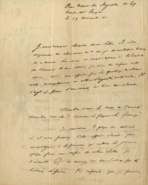 STENDHALlettre autographe adressée à Donato Bucci à Civitavecchia. [Paris], 19 novembre 1841 ; 3 pages petit in-4, adresse. Une des dernières lettres de Stendhal (il mourra quatre mois plus tard, le 22 mars 1842). Il vient de prendre un abonnement au Constitutionnel. « Voici une affaire pour laquelle je réclame votre complaisance et votre sagacité ordinaires. Il s'agit, je pense, d'une vente, on tient au secret. Combien vaut la terre de Canino ? Combien rend-elle ? Comment se payent les fermages ? Je voudrais 3 pages de détails, 4 si vous pouvez. Cette affaire serait fort avantageuse à la personne qui cultive la garance. [...] J'ai répondu que je pourrais donner des renseignemens vers le 4 ou 5 décembre. Peut-être serez-vous obligé d'écrire sur les lieux. En ce cas écrivez une première lettre pour donner les renseignemens que vous savez, et annoncez que vous avez écrit sur les lieux, et avec secret, pour obtenir plus de détails. On verra ainsi que j'ai mis du soin à faire la commission. Beaucoup de détails, sur le revenu, sur la manière de le percevoir. S'il fallait dans la suite un administrateur je vous proposerai, cela vous conviendrait-il ? Vous feriez 3 voyages par an. Surtout beaucoup de détails. Quel bâtiment pourrait habiter le nouveau propriétaire s'il allait passer 4 mois d'hiver dans le pays ? »... Il fait une récapitulation en 4 points. Bibliographie : Correspondance générale, t. VI, n° 3168.