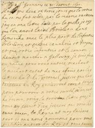 JACQUES IILettre autographe signée « J R [ex]», adressée au futur duc de Lauzun, en français. Château de Saint-Germain-en-Laye, 31 août 1690 ; 1 page 1/4 in-4°, adresse au dos, cachet armorié de cire rouge, petite déchirure due à l’ouverture sans atteinte au texte. « JE VOY QUE L’ON AVOIT LAISSÉ bOISLEAU DANS LIMERIKE AVEC LE PLUSPART DE L’INFANTERIE IRLANDOIS ET QUELQUE CAVALRIE ET DRAGONS, ET QUE VOTRE INFANTRIE ET LE CANNON DEVOIT MARCHER À GALLOWAY. JE SUIS FORT EN PAINE POUR VOUS AUTRES, SÇACHANT LE MÉCHANT ESTAT DE MES AFFAIRS par les lettres du d[uc] de Tyrconnel [Richard Talbot, vice-roi catholique d’Irlande, un des chefs militaires de l’armée jacobite]. J’espère que les vaisseaux du roy arriveront assez à temps pour pourvoir à votre sûrté, s’il en est le besoin […]. La reyne et moy faisons tout ce que nous pouvons pour vous justifier auprez du roy et vous pouvez […] vous assurer que je ne manqueré pas de le faire e[n] tout temps et en tout lieu. »LA RÉSISTANCE HÉROÏQUE DE BOISSELEAU DANS LIMERICK. Après la défaite de la Boyne (11 juillet 1690), l’armée franco-irlandaise de Lauzun et Tyrconnell se replia sur l’Ouest entre Galway et Limerick. Guillaume II assiégea cette dernière mais dut se retirer en septembre devant la détermination du maréchal de camp Alexandre de Rainier de Droué, marquis de Boisseleau qui commandait la place. Peu après, Lauzun et Boisseleau rentrèrent en France, laissant les troupes jacobites sous le commandement du futur maréchal de Berwick, fils naturel de Jacques II.