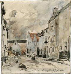 JONGKIND Johan BartholdUne rue à Bruxelles - 1866. Aquarelle sur papier, signée en bas vers le centre ; sur la droite de la signature, localisée Bruxelles et datée 7 sept 1866. Gouache et aquarelle sur papier. Signée, située et datée en bas. 27,7 x 26 cm. Sur la droite de l'aquarelle, quelques façades de maison ; dans la rue, une femme se déplace ; plus en retrait, sur la gauche de l'aquarelle, une charrette autour de laquelle un ou deux hommes s'affairent ; le ciel est nuageux et légèrement tourmenté. Note: Apparaît sous la référence G01428 dans les archives du Comité Jongkind, Paris-La Haye. Une lettre d'inclusion dans le catalogue critique de l'oeuvre de Jongkind et rédigée par le comité Jongkind Paris-La Haye sera remise à l'acquéreur. Provenance : Maître Alexandre LOEB. Christine LOEB, nièce du précédent.