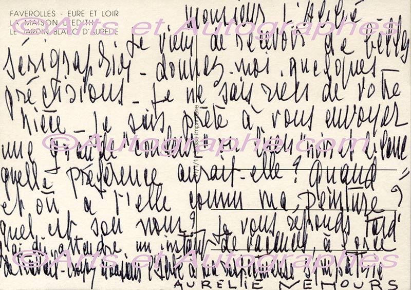 Carte autographe signéeCarte autographe signée, adressée à un abbé. Sans date ; 145 X 105 mm. « Je viens de recevoir de belles sérigraphies. Donnez-moi quelques précisions. Je ne sais rien de votre nièce. Je suis prête à vous envoyer une grande couleur...