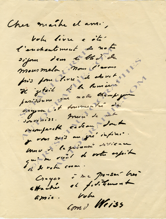 Lettre autographe signéeLettre autographe signée, adressée à Maurice Verne. 23 septembre 1928 ; 1 page in-4°, enveloppe timbrée jointe. « Votre livre a été l’enchantement de notre séjour dans le bled de Mourmelon. […] Il jetait de la lumière...