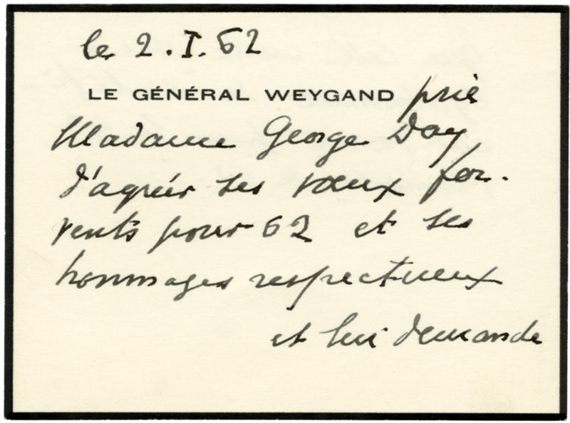 Carte autographe signéeCarte autographe signée, adressée à Mme George-Day. 2 janvier 1962 ; 2 pages in-32 oblongues sur carte de deuil. Il lui envoie ses vœux et « lui demande que cette carte lui serve de “certificat de vie” pour le 4e trimestre de 61.»