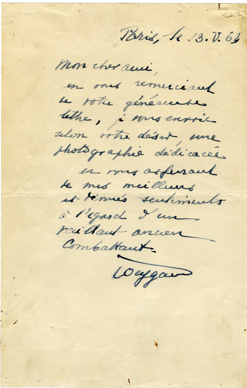 Lettre autographe signéeLettre autographe signée, adressée à un ami. Paris, 13 mai 1963 ; 1 page in-8°. « En vous remerciant de votre généreuse lettre, je vous envoie selon votre désir, une photographie dédicacée en vous assurant de mes meilleurs et...