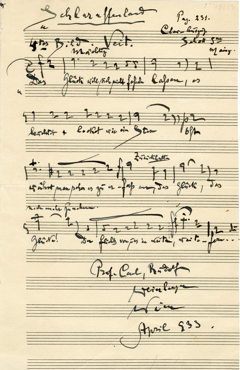 Pièce musicale autographe signée, intitulée « Schlaraffenland »Pièce musicale autographe signée, intitulée « Schlaraffenland ». Vienne, avril 1933 ; 22 x 14,5 cm.« Clav(ier)-Auszug Schott S(öh)ne Mainz ». Signé « Prof. Carl Rudolf Weinberger ».