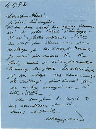 Lettre autographe signéeLettre autographe signée, adressée à Max Aghion. [Plou Jean], 18 août 1930 ; 1 page in-8°, sur papier bleu avec en relief « Coatamour, Plou Jean, Morlaix, Finistère ». « Je suis très confus de ne vous avoir encore remercié de...