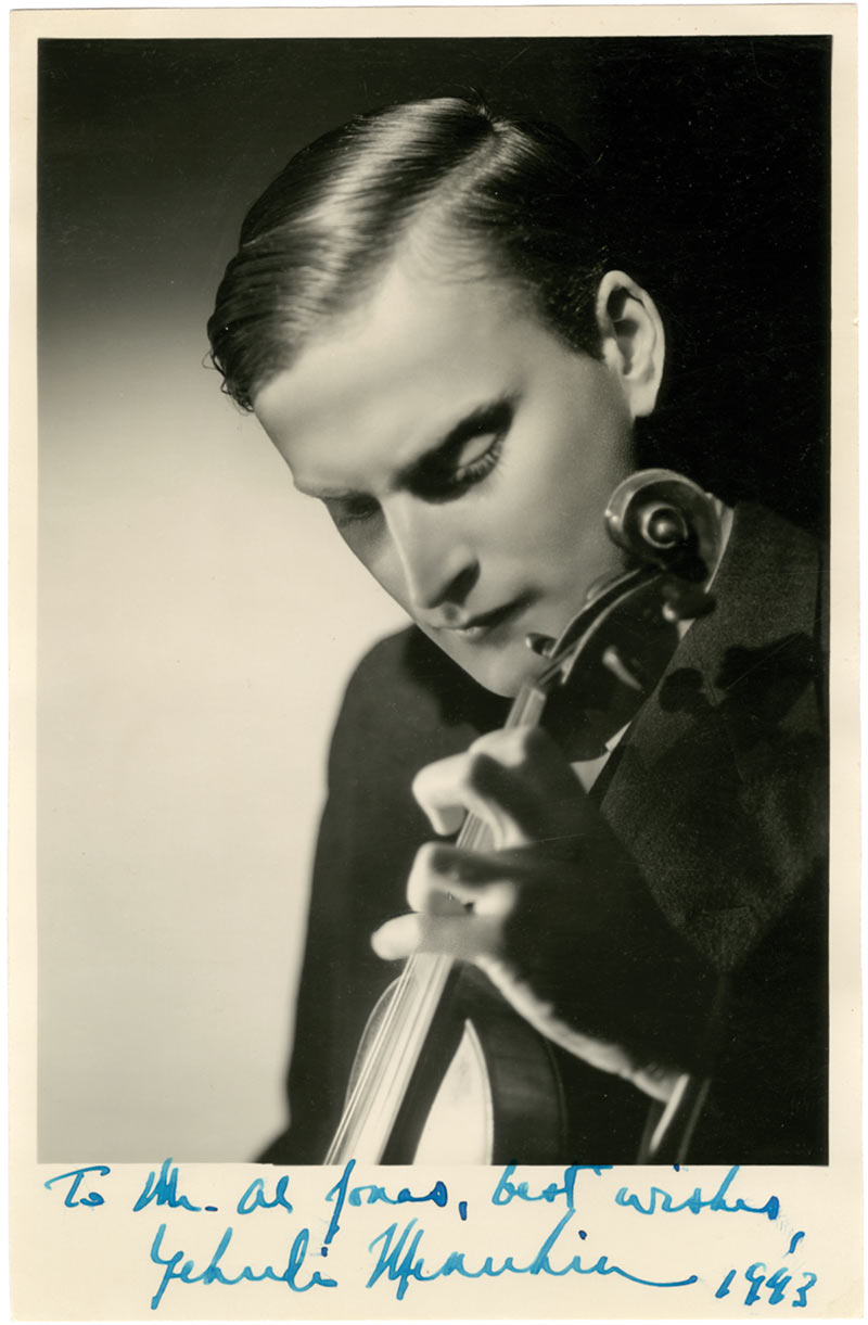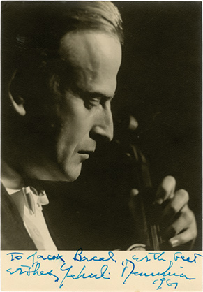 Photographie dédicacéePhotographie signée, dédicacée. 14,7 X 10 cm. Photographie sur papier mat dédicacée en 1961 : « To Jack Bacal, with best wishes Yehudi Menuhin ».