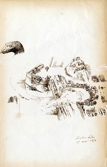 Dessin original à la plume signé et datéDessin original à la plume signé et daté. 17 mai 1854 ; 158 X 245 mm. Vue d’une place fortifiée, à vol d’oiseau, entourée d’eau sur la gauche. En haut à gauche, tête de serpent dessinée à la plume avec soin. Très jolie...