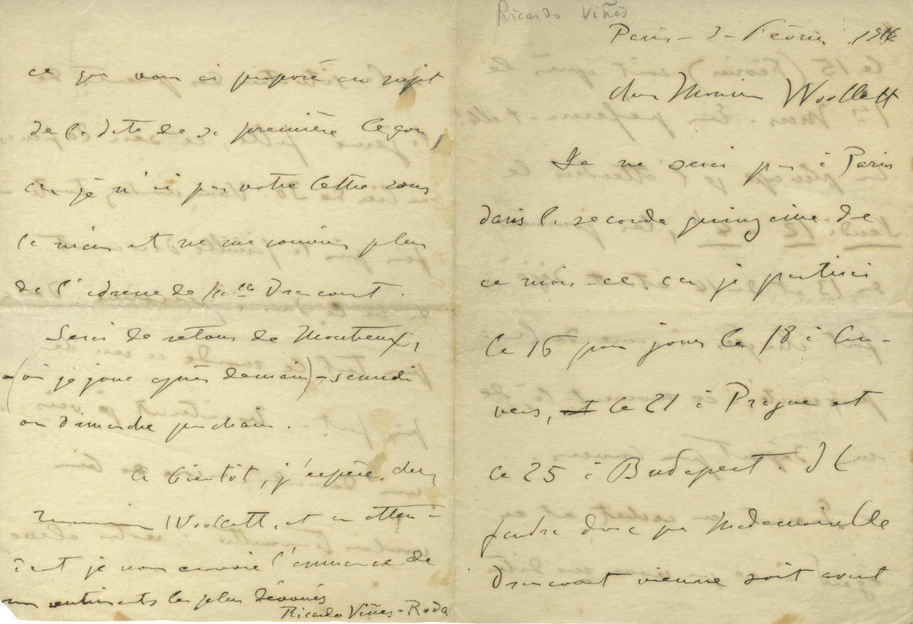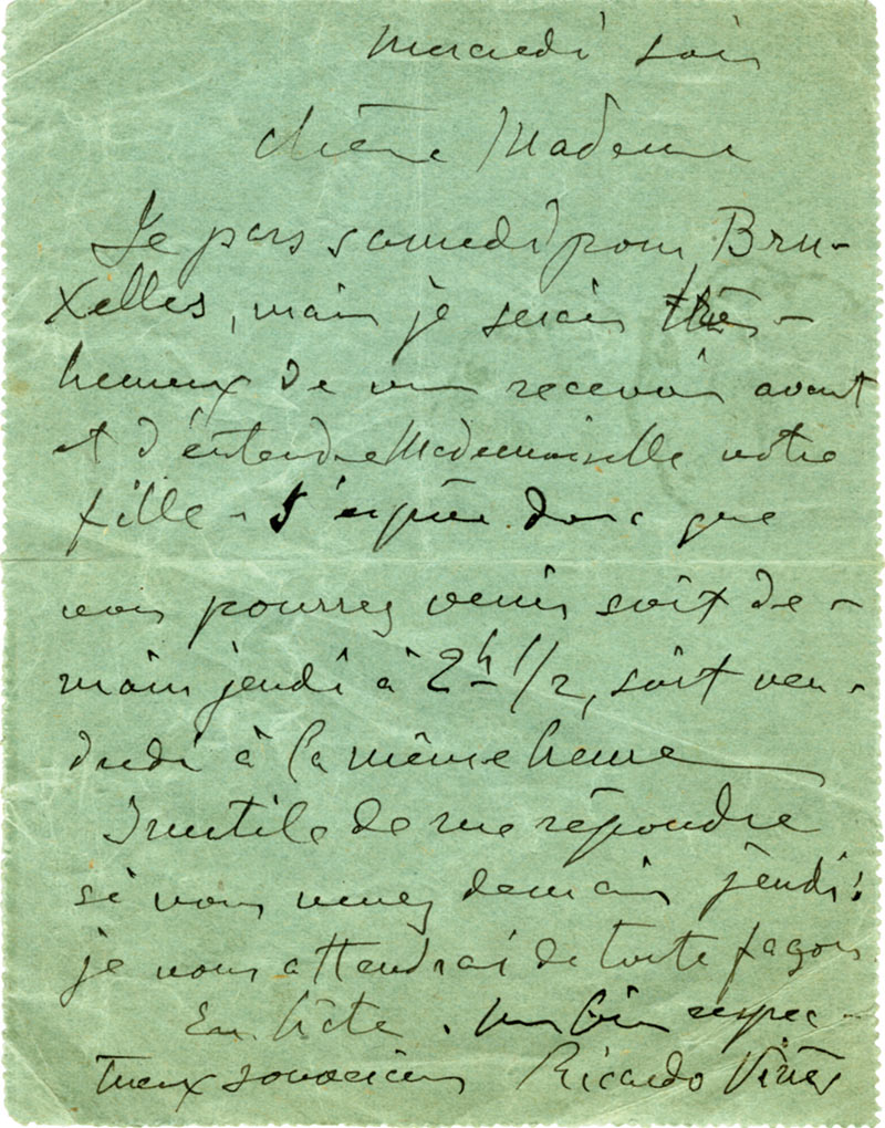 Ensemble de 4 lettres autographes signéesEnsemble de 4 lettres autographes signées [adressée à Jean Cras ou à sa femme]. 11 pages in-12, une lettre avec amorces de fentes.— 6 janvier 1902 : « Croyez que le plaisir de se voir encore une fois avant votre départ sera...