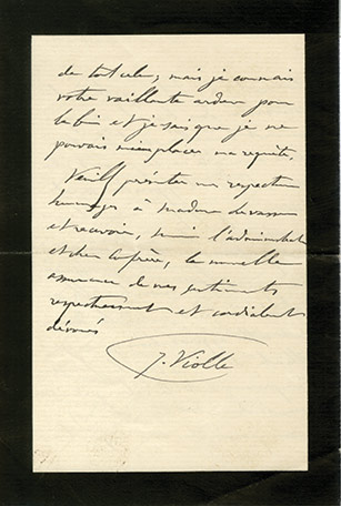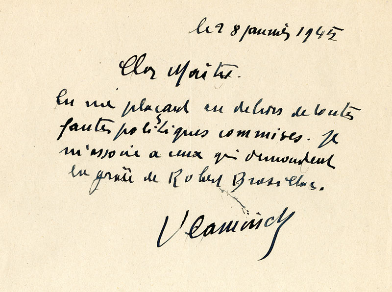 Billet autographe signéBillet autographe signé, destiné à maître Isorni. 28 janvier 1945 ; 1 page in-8° oblongue. « Cher Maître, En me plaçant en dehors de toutes fautes politiques commises, je m’associe à ceux qui demandent la grâce de Robert...