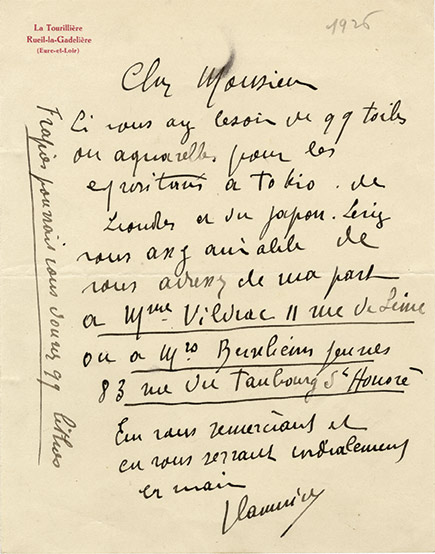 Lettre autographe signéeLettre autographe signée, adressée à Raymond Nacenta, directeur de la galerie Charpentier. Crécy-en-Brie, 8 octobre 1953 ; 1 page in-4°, trous d’archivage. « J’ai l’honneur de vous communiquer que d’apre notre causerie de...