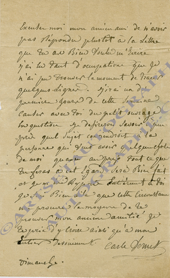 Lettre autographe signéeLettre autographe, signée « Carle Vernet », adressée à un ami, M. Le Brun, habitant rue du Gros-Chenet n°4 à Paris, « dimanche » [29 septembre 1811] ; 1 page in-8°. « Excusez-moi mon ancien ami de n’avoir pas répondu plus...