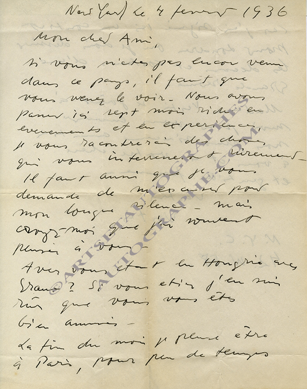 Ensemble de lettres autographes signéesEnsemble de 3 lettres autographes signées, adressées à Paul Brach. 1936 ; 3 pages in-4°. Il l’incite à découvrir les États-Unis, pays riche en expériences. Il pense être à Paris à la fin du mois, car il a signé un contrat pour...