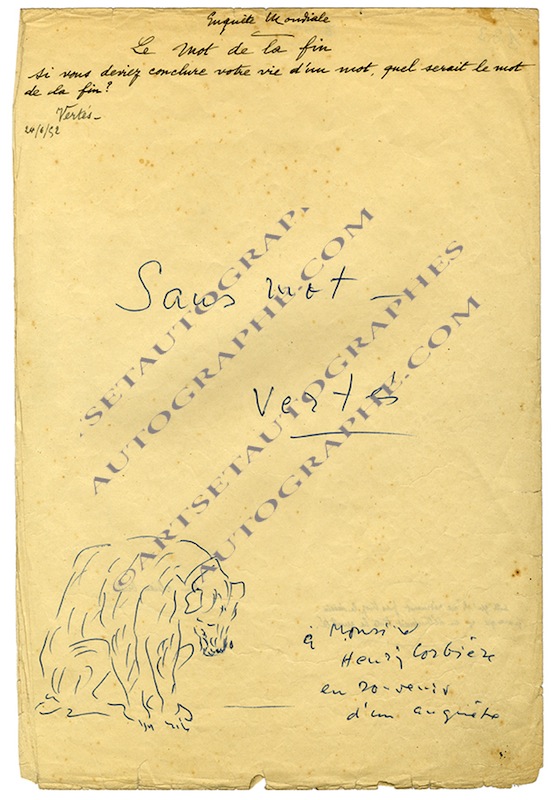 Pièce autographe signéePièce autographe signée. 20 juin 1952 ; 1 page in-4°. Réponse à une enquête d’Henri Corbière : « Le mot de la fin : si vous deviez conclure votre vie d’un mot, quel serait le mot de la fin ? » Vertes répond : « Sans mot....