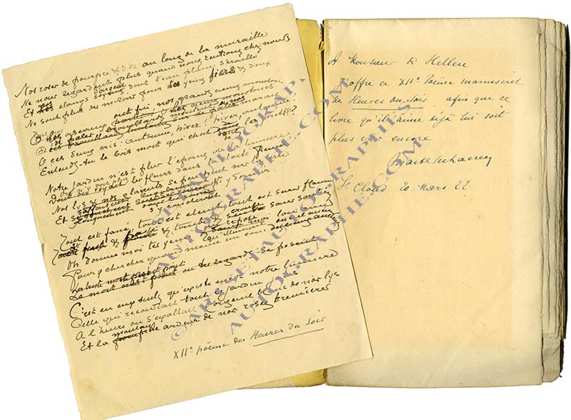 « Les Heures du soir précédées de Les Heures claires, Les Heures d’après midi »« Les Heures du soir précédées de Les Heures claires, Les Heures d’après-midi ». Mercure de France, Paris, 1921 ; 215 x 140 mm, broché (1er et dernier feuillets brunis par décharge). Grand papier non coupé. Envoi autographe...