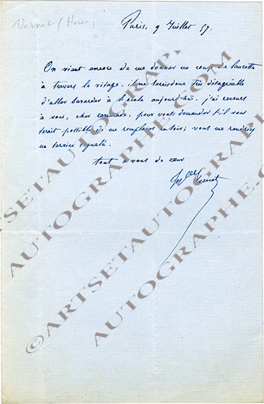Lettre autographe signéeLettre autographe signée. Paris, 9 juillet 1857 ; 1/2 page in-8°. « On vient encore de me donner un coup de lancette à travers le visage. Il me serait donc très désagréable d’aller bavarder à l’école aujourd’hui. J’ai...